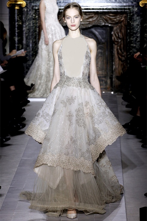 Dresses in the Valentino Haute Couture show were covered in layers of crepe and tulle, ever so slightly voluminous and ethereal. In particular, the sheer gown above features a sensual mix of almost nude organza with an overlay of intricate red piping. According to style.com, “it took 500 hours of hand-rolling to produce the piping. And that was just one of the outfits that featured the effect. One roller apparently developed carpal tunnel syndrome during the production of the collection.” Old school classic pieces still walked the runway in the form of cape dresses and garden party dresses.