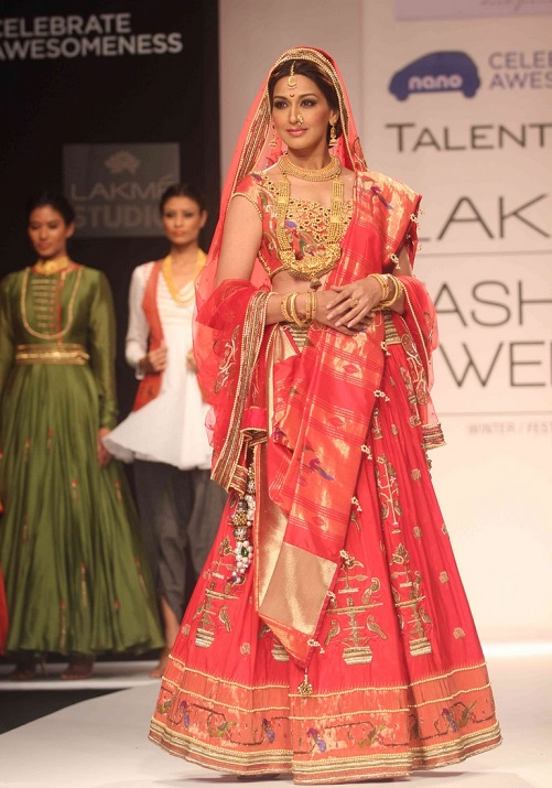 Sonali in Designer Arpita Mehta Bridal Lehenga At Lakme Fashion Week 2013. Pure silk orange/red lehenga embellished with creative embroidery bunches birds and tree all around. The choli is embroidered with zari work paired with silk dupatta embroidered with peacocks pattern.