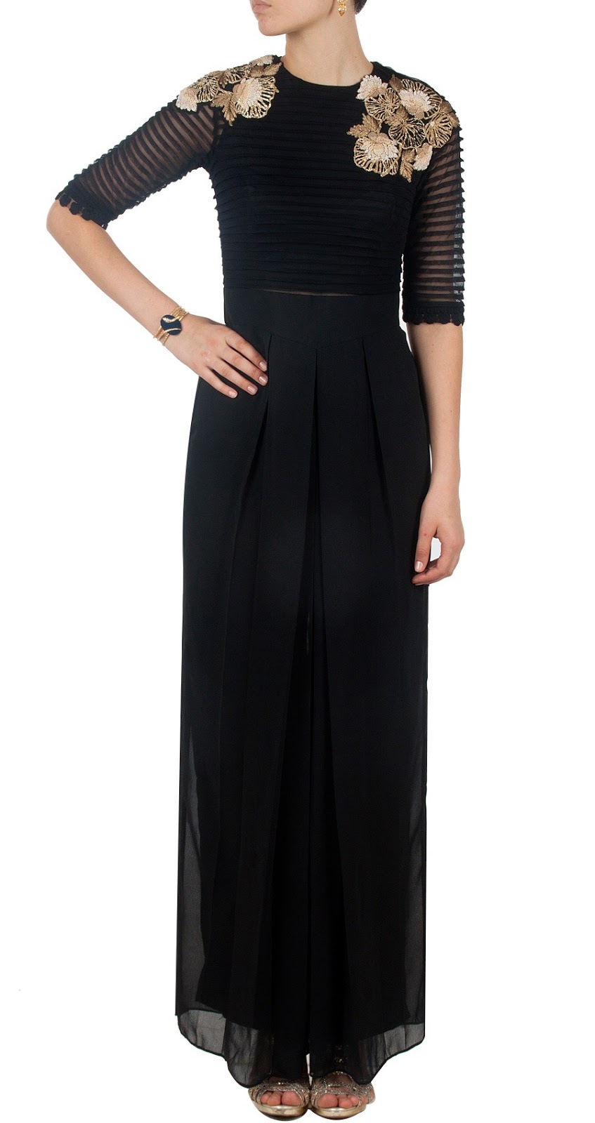 Featuring a black pleated and wide legged georgette jumpsuit with floral pattern gold dabka and resham work shoulders.